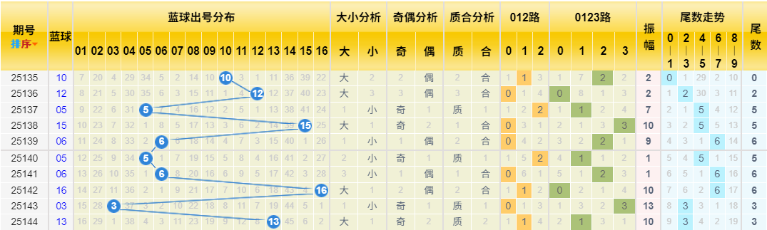蓝球近期走势为“小(03)-大(13)”,在大号区停留。本期需关注号码的区间平衡,可能回落至中区(07-12),该区间内1路(07, 10)、0路(09, 12)、2路(08, 11)号码密集,是博弈焦点。