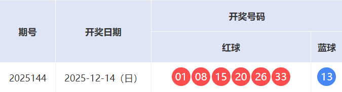 上期开奖号码:01 08 15 20 26 33 + 13。