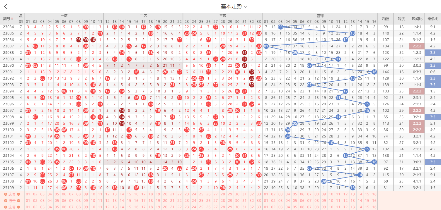 1、红球特征分析:(通过整体走势不难看出每期开奖号都具备以下明显的特征点)