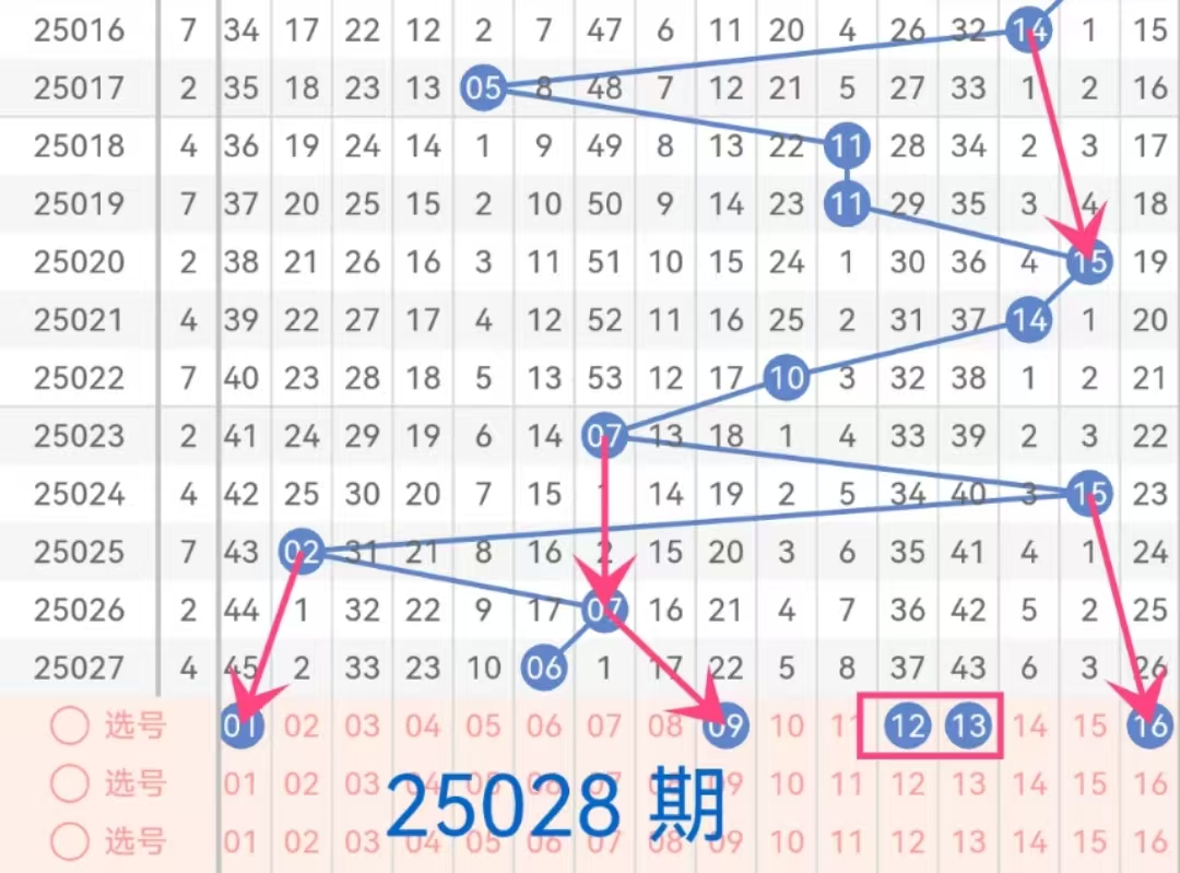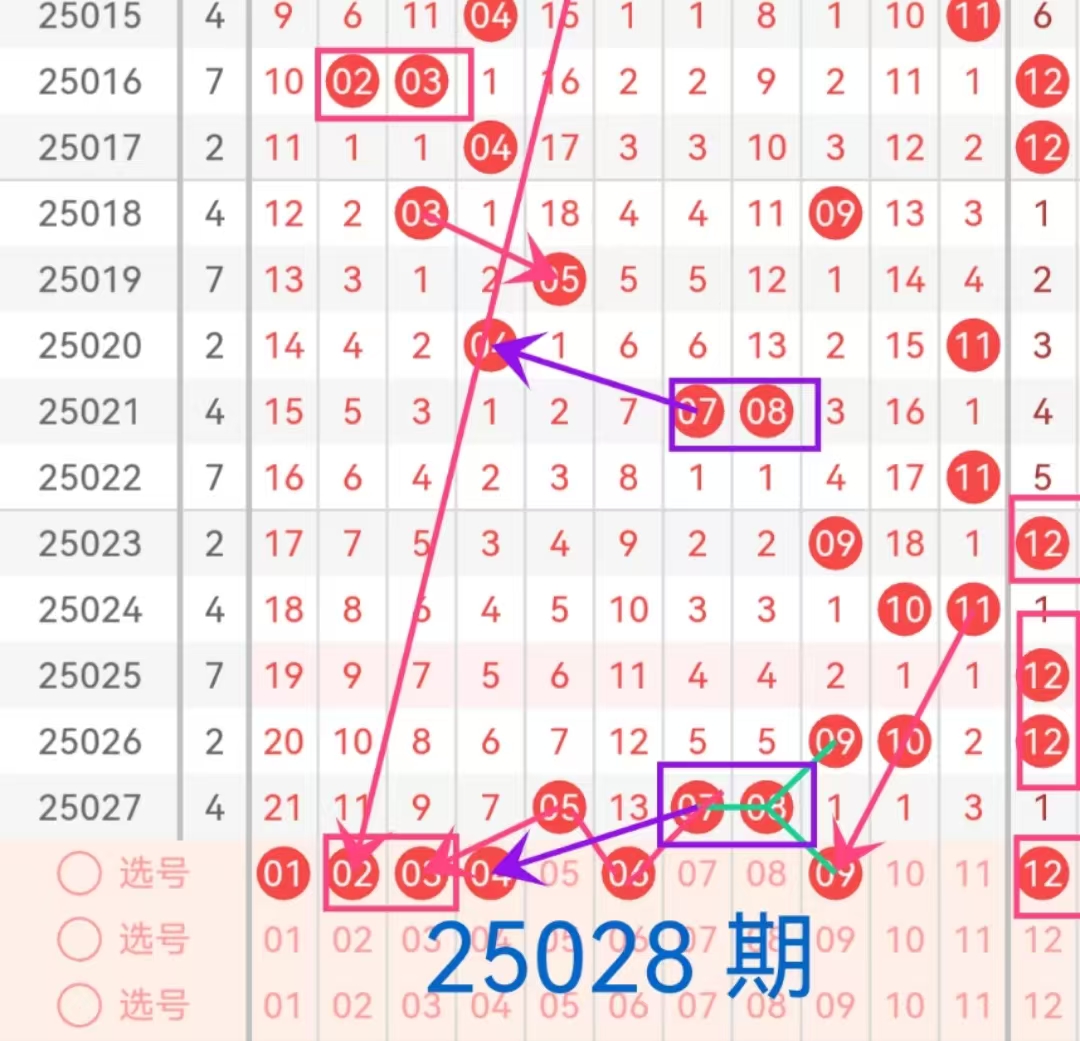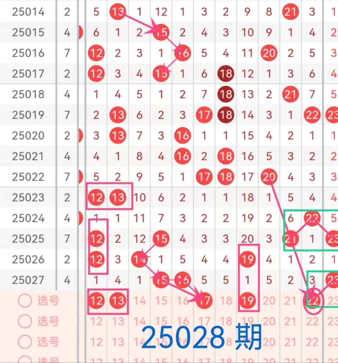2. 第二区间(12-22):此区间在上期开出两个号码15、16,号码15和号码16为一组连号,且号码15与前期号码14形成斜连走势,从历史数据来看,该区间内的号码出现频率较高。该区间内的号码可能有所上升,本期可关注号码12、13、17、19、22。