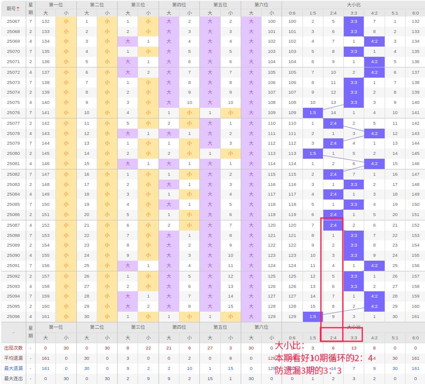 上期大小比:1:5,近10期大小比出现情况:2:4、3:3、3:3、3:3、4:2、3:3、3:3、4:2、4:2、1:5,最近10期出现4期3:3,出现4期4:2,出1期2:4,出现0期5:1,出现1期1:5,出现0期6:0,出现0期0:6,根据近10期规律本期看好10期循环的2:4,防遗漏3期的3:3,综上所述推荐大小比推荐:3:3,重点关注:2:4。