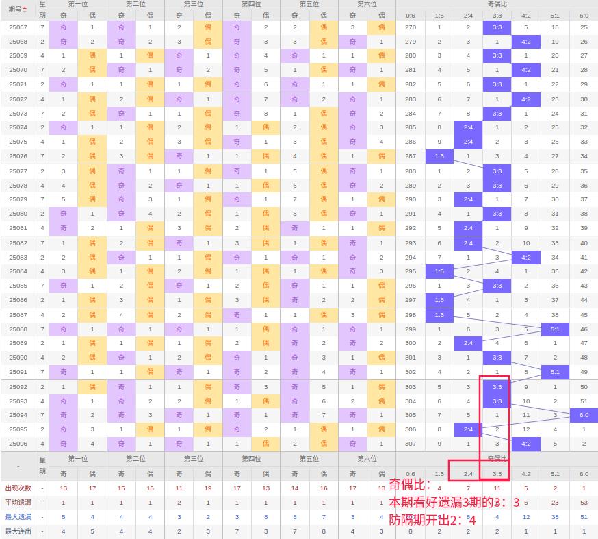 上期奇偶比:4:2,近10期奇偶比出现情况:1:5、5:1、2:4、3:3、5:1、3:3、3:3、6:0、2:4、4:2,最近10期出现4期3:3,出现1期4:2,出现2期2:4,出现2期5:1,出现1期1:5,出现1期6:0,出现0期0:6,根据近10期规律本期看好遗漏3期的3:3,防隔期开出2:4,综上所述推荐奇偶比推荐:2:4,重点关注:3:3。
