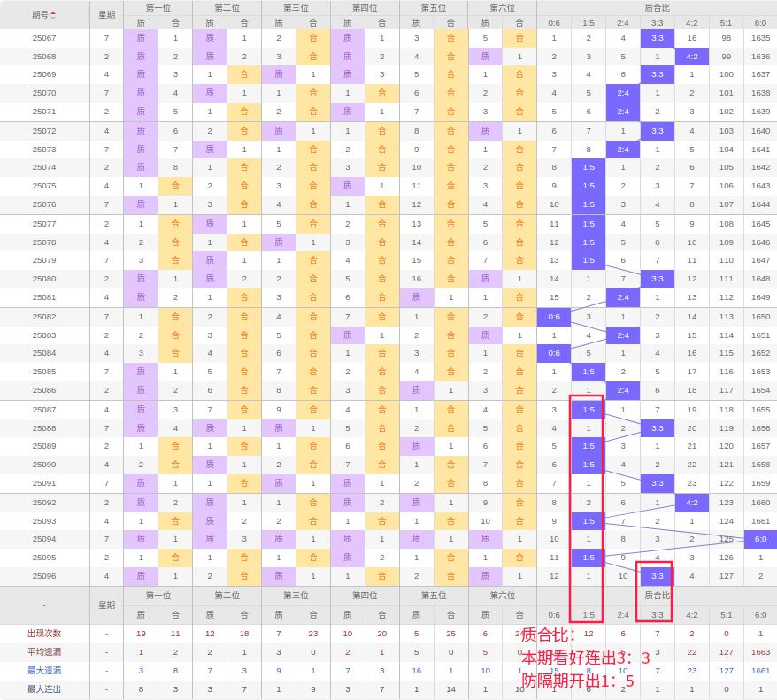 上期质合比:3:3,近10期质合比出现情况:1:5、3:3、1:5、1:5、3:3、4:2、1:5、6:0、1:5、3:3,最近10期出3期3:3,出现1期4:2,出现0期2:4,出现0期5:1,出现5期1:5,出现1期6:0,出现0期0:6,根据近10期规律本期看好连出的3:3,防隔期开出的1:5,综上所述推荐质合比推荐:1:5,重点关注:3:3。