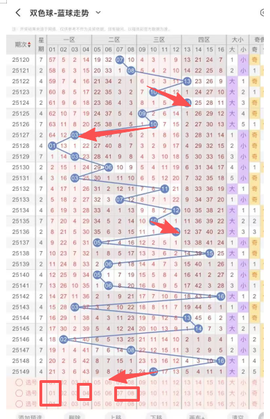 上期蓝球开出10,属于1路号,本期蓝球不看07 08 09 10 11,看好出01、 02、 03 、04、 05 、12、 13、 14、 15 、16,这些号码属于边号,个人比较看好出1路号01、 04、 07 、10、 13 、16,10排除了,剩余的号可防出号。
