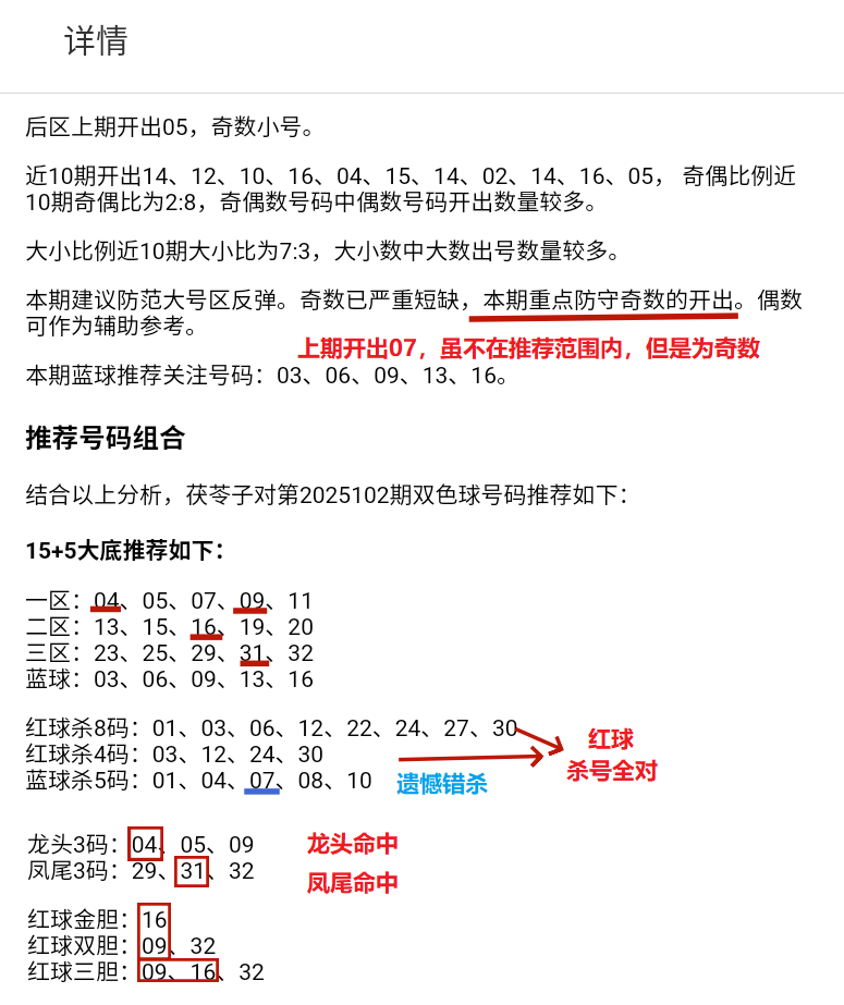 结合以上分析,茯苓子对第2025103期双色球号码推荐如下: