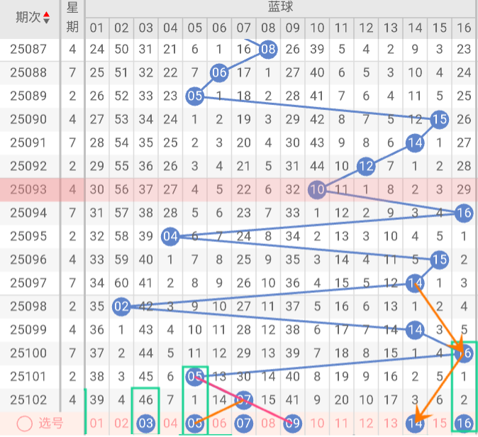 本期蓝球推荐关注号码:03、05、09、14、16。