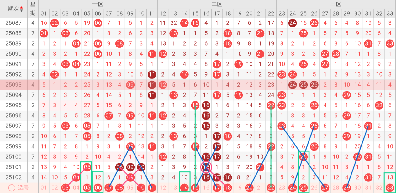 根据以上特点,我们对双色球第25102期进行如下分析: