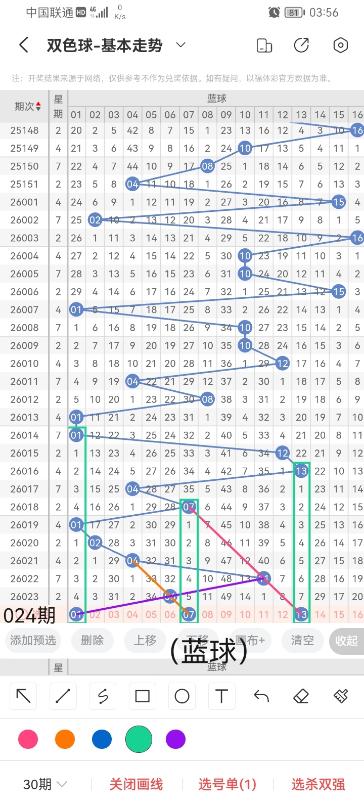 小梁结合上面图中画线思路分析得出,最后给大家汇总提供一下本期红球、蓝球数据,供大家参考: