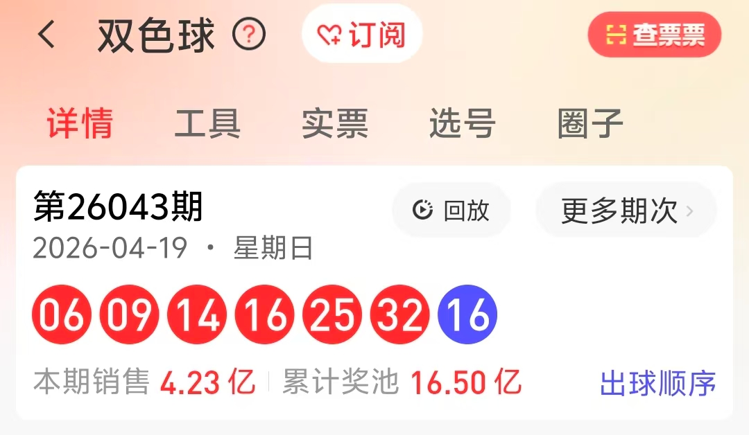 福彩双色球上期开奖号码如下红球691416、2532 蓝球10