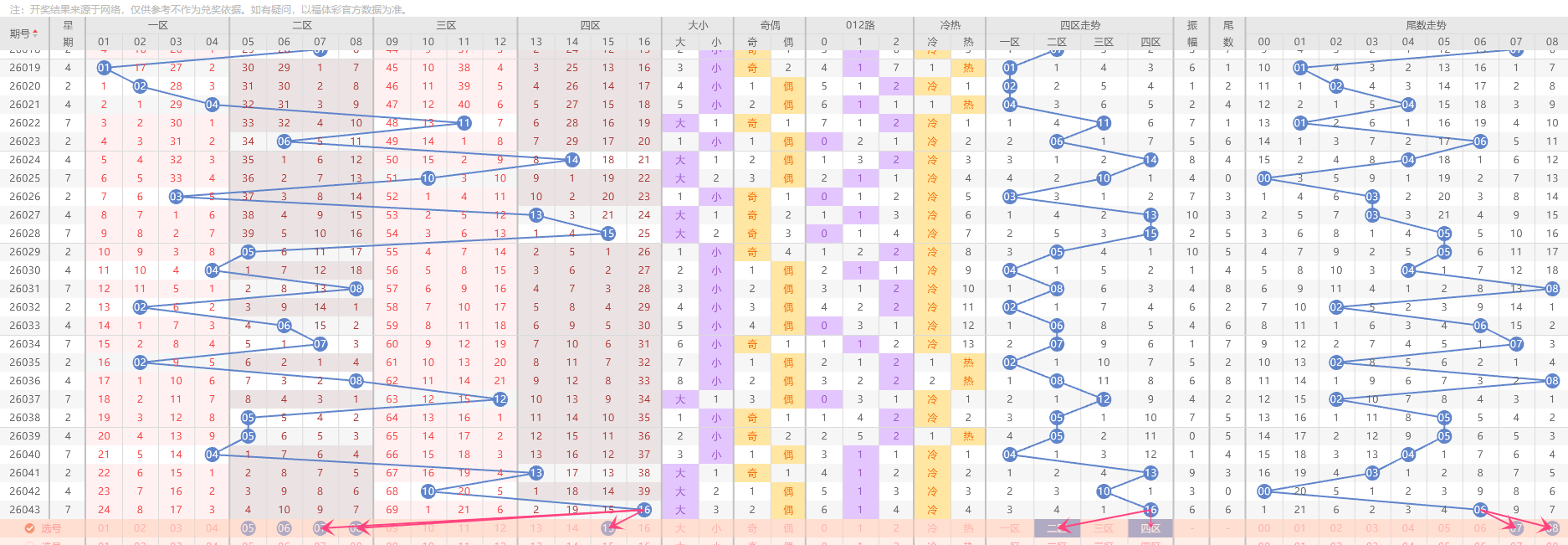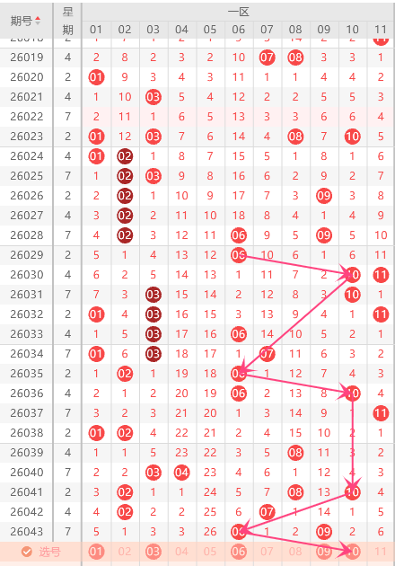 第一区间的走势分析:第一区间上期开出了2个号码球,走出了02的形态走势,根据一区间的走势规律,今天的一区间我们主看6根据6的走势规律,可重点关注10号位。个号球重点关注610的组合