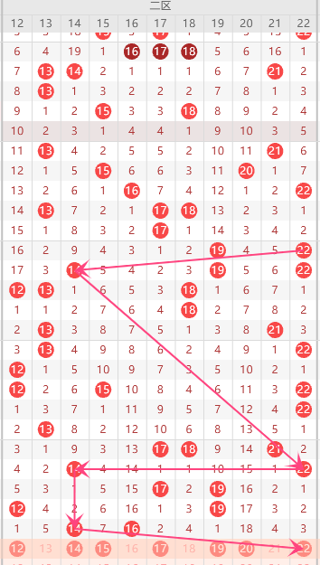 第二区间的走势分析:第二区间上期开出了2个号码球,走出了11的形态走势,根据二区间的走势规律,今天的二区间我们主看14根据14的落球规律,重点关注1722组合