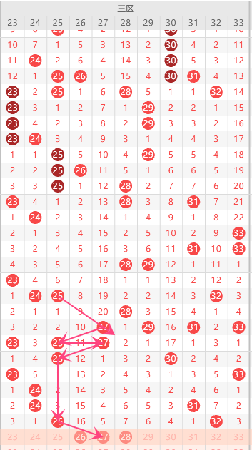第三区间的走势分析:第三区间上期开出了2个号码球,走出了11的形态走势,根据三区间的走势规律,今天的三区间我们主看2525的落球规律,重点关注2728组合