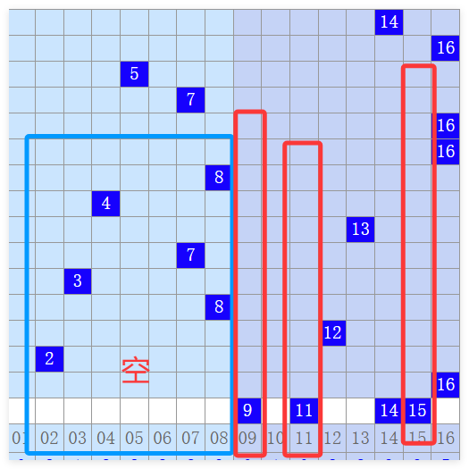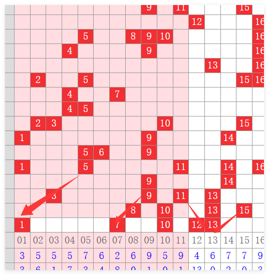 最后大家看一下蓝号,蓝号的话,上一期开的一个比较一个大的跨度16,那么本期的话,我们通过观察发现蓝号已经进行了两次比较大的一个跨度,一个是10跨,一个是14跨。那么本期我们把这个跨度控制在10跨度之内,也就是说蓝号呢会是在06~15之间产生,我们排除了重号16,那么其中呢有冷号09。