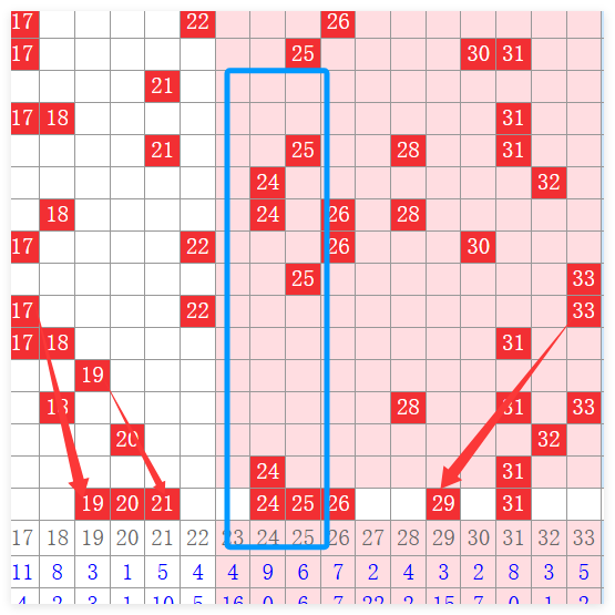 最后大家看一下第三分区的大号,第三分区大号上期开了24和31,明显的产生一个断区。这个21.34这个区间的话,是有号码进行回补,那么还是要注意一下2431有重的一个可能性。像31号如果重复的话,很有可能会和29进行搭配。如果是24进行重复的话,很可能会形成连号24.25.26这是大号的一个分析情况,那么32和33本期有可能就不做考虑,所以说整体上红球的一个情况还是比较的好梳理。