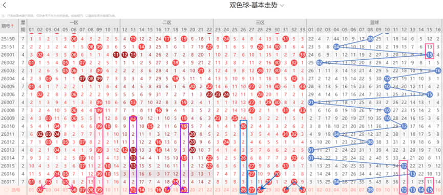 上一期三区开出了2个号码,本期三区断区的可能性小,本期三区出号数量可以考虑2个,防3个;本期三区需要关注的号码:27为隔期码;26-27可能会一起落号;28与29-30形成了斜连走势;31-33为邻号;因此本期三区选号应该考虑26-27-28-31-33等号码。