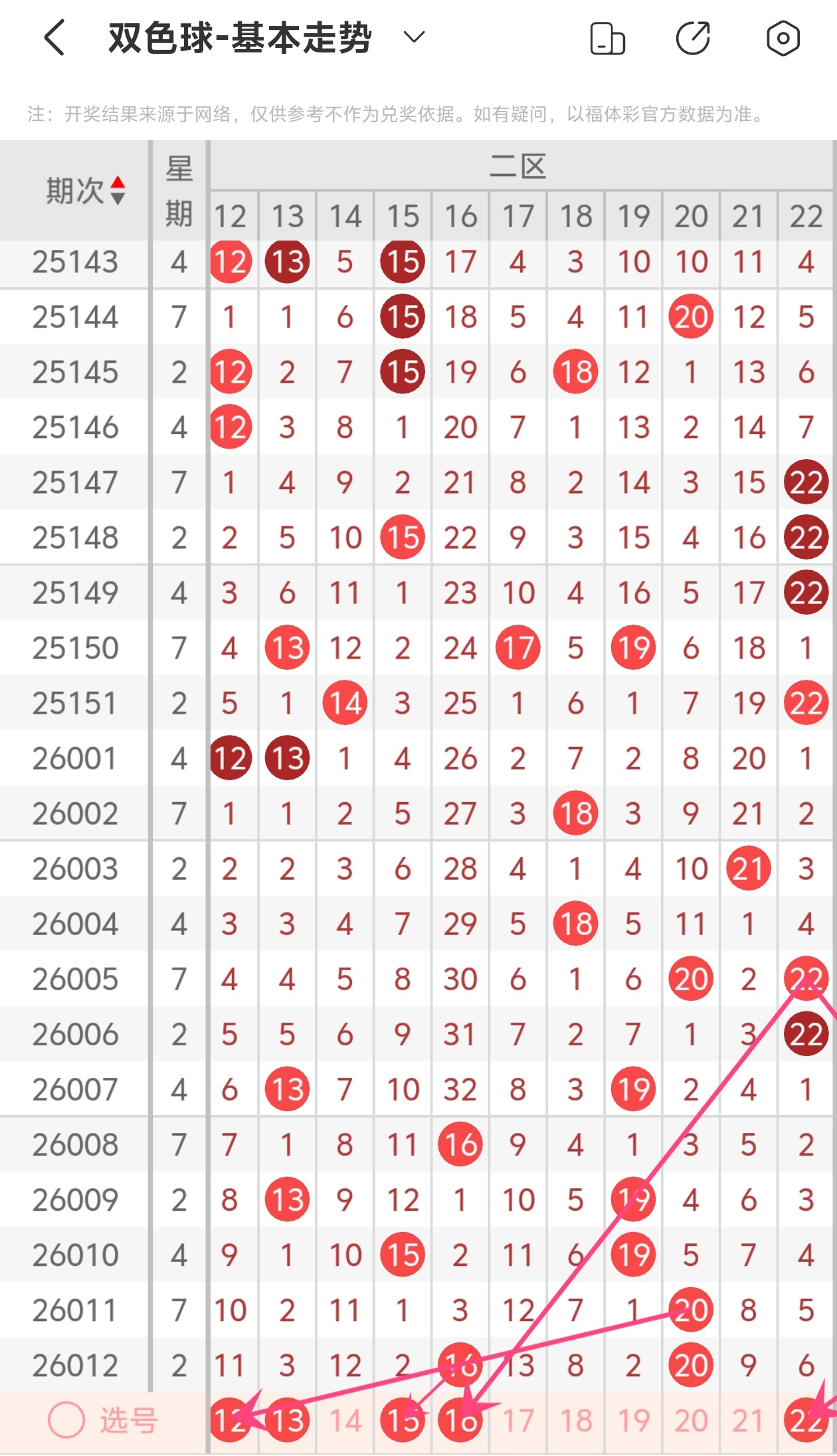 上期第二区间开出16 20,本期我们可以从上面走势图中看到选号的思路,12为斜连走势,16为斜连走势,22为斜连走势,综合以上分析本期第二区间推荐12 15 16 22