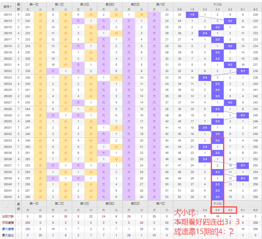 上期大小比:3:3,近10期大小比出现情况:3:3、2:4、3:3、2:4、5:1、3:3、5:1、3:3、3:3、3:3,最近10期出现6期3:3,出现0期4:2,出2期2:4,出现2期5:1,出现0期1:5,出现0期6:0,出现0期0:6,根据近10期规律本期看好四连出的3:3,防遗漏15期的4:2,综上所述推荐大小比推荐:4:2,重点关注:3:3。