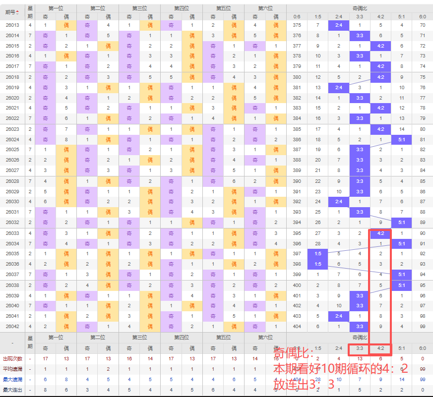 上期奇偶比:3:3,近10期奇偶比出现情况:4:2、5:1、1:5、1:5、5:1、5:1、3:3、3:3、2:4、3:3,最近10期出现3期3:3,出现1期4:2,出现1期2:4,出现3期5:1,出现2期1:5,出现0期6:0,出现0期0:6,根据近10期规律本期看好10期循环开出4:2,防连出的3:3,综上所述推荐奇偶比推荐:3:3,重点关注:4:2。