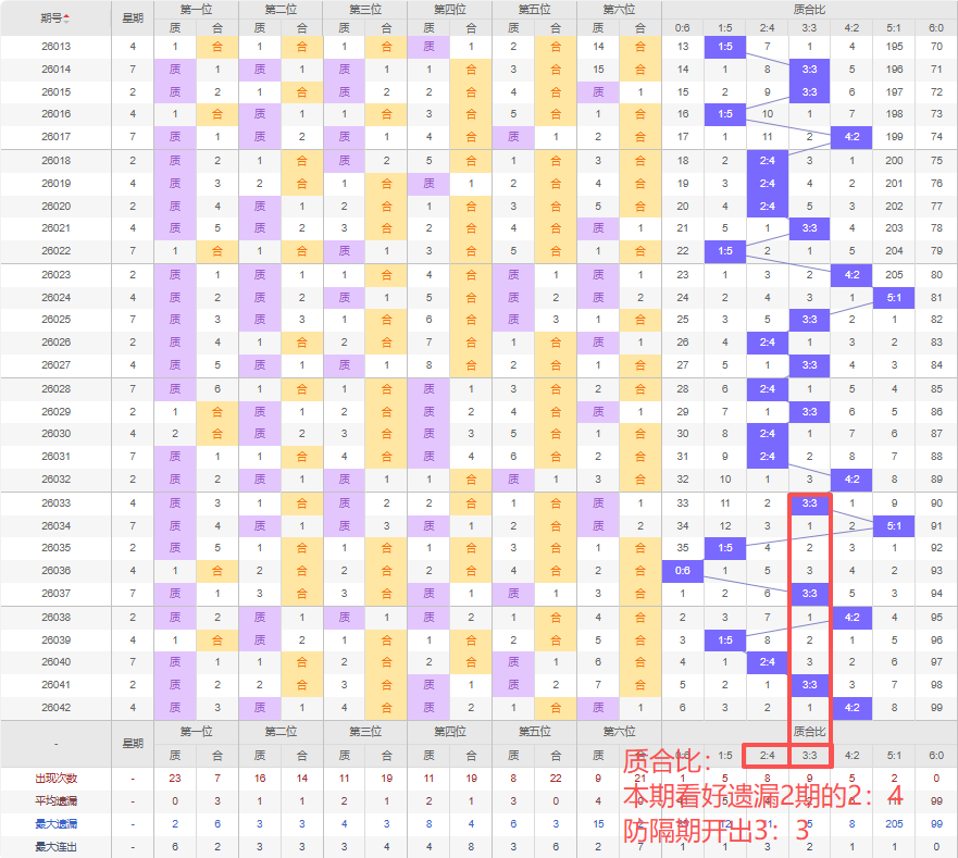 上期质合比:4:2,近10期质合比出现情况:3:3、5:1、1:5、0:6、3:3、4:2、1:5、2:4、3:3、4:2,最近10期出3期3:3,出现2期4:2,出现1期2:4,出现1期5:1,出现2期1:5,出现0期6:0,出现1期0:6,根据近10期规律本期看好遗漏2期2:4,防隔期的3:3,综上所述推荐质合比推荐:3:3,重点关注:2:4。