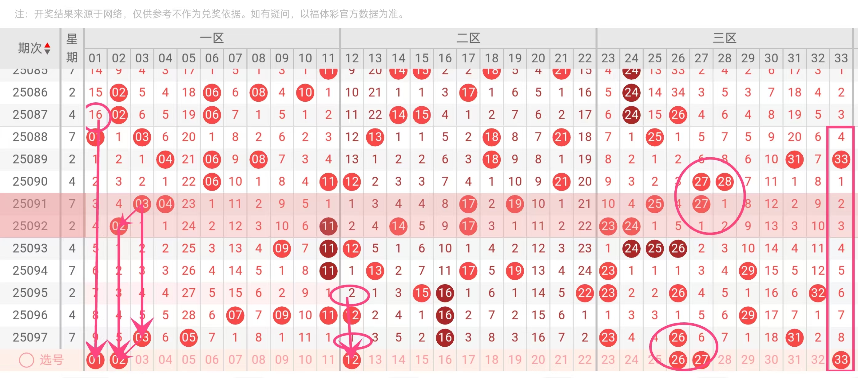 三区(23-33):3个号码(26、27、33) 这个3:1:2的区间分布既照顾了各个区域的出号可能性,又符合近期三区号码活跃的趋势。