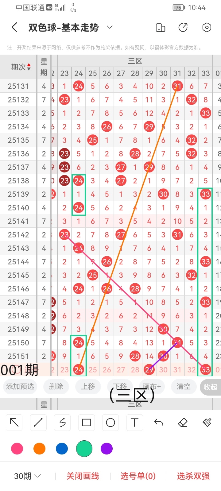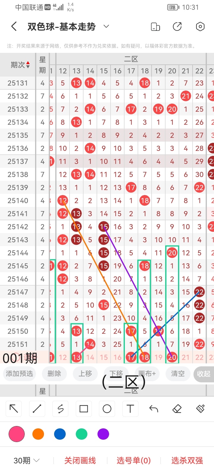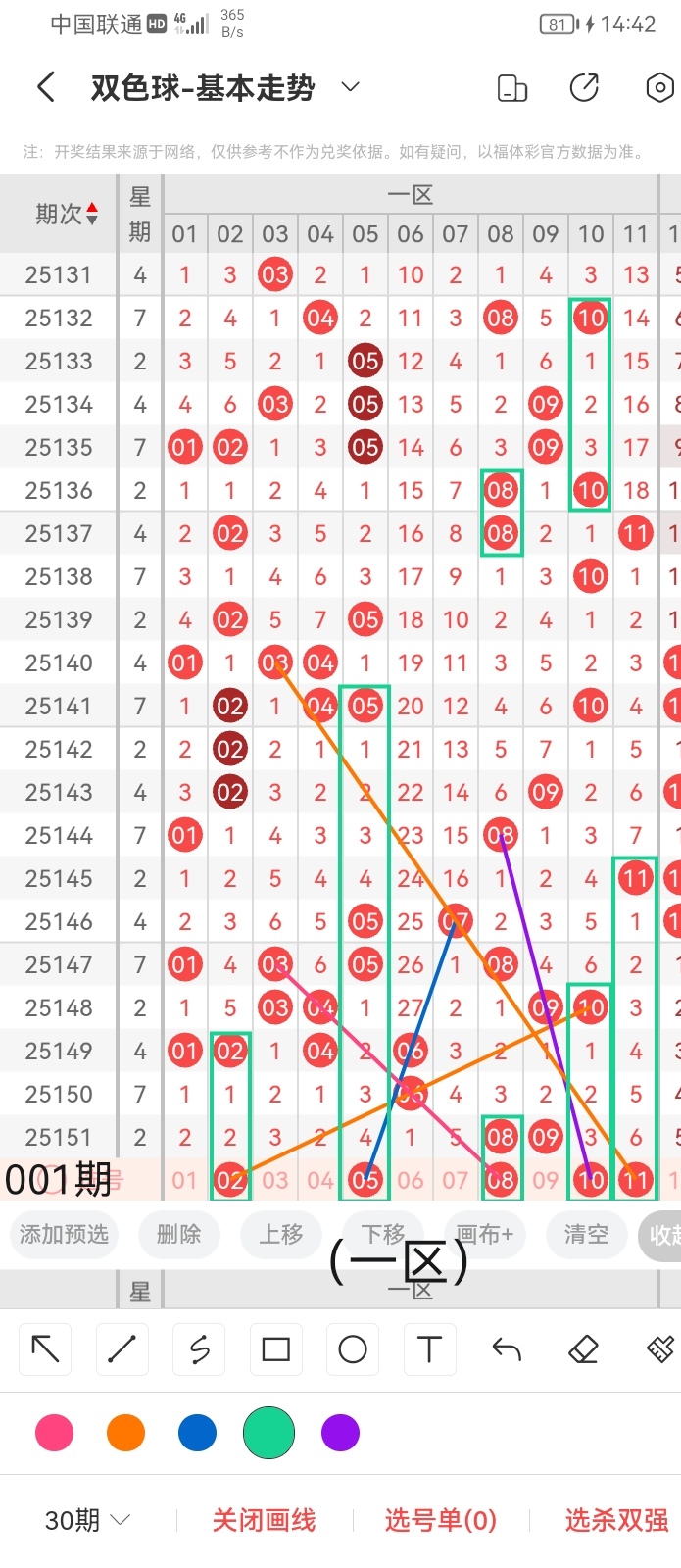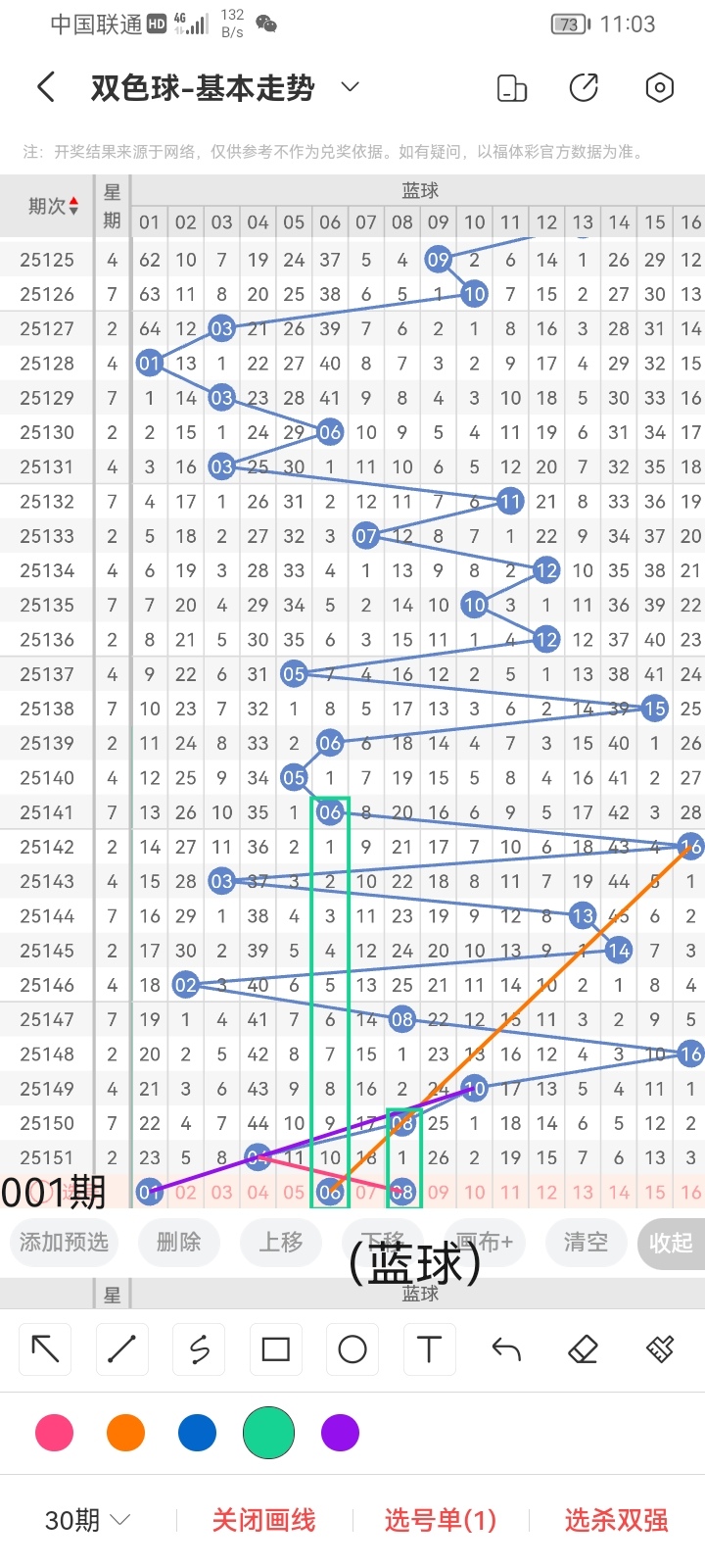 小梁根据上面图中画线思路及走势分析,最后给大家汇总提供一下本期红球、蓝球数据,供大家参考: