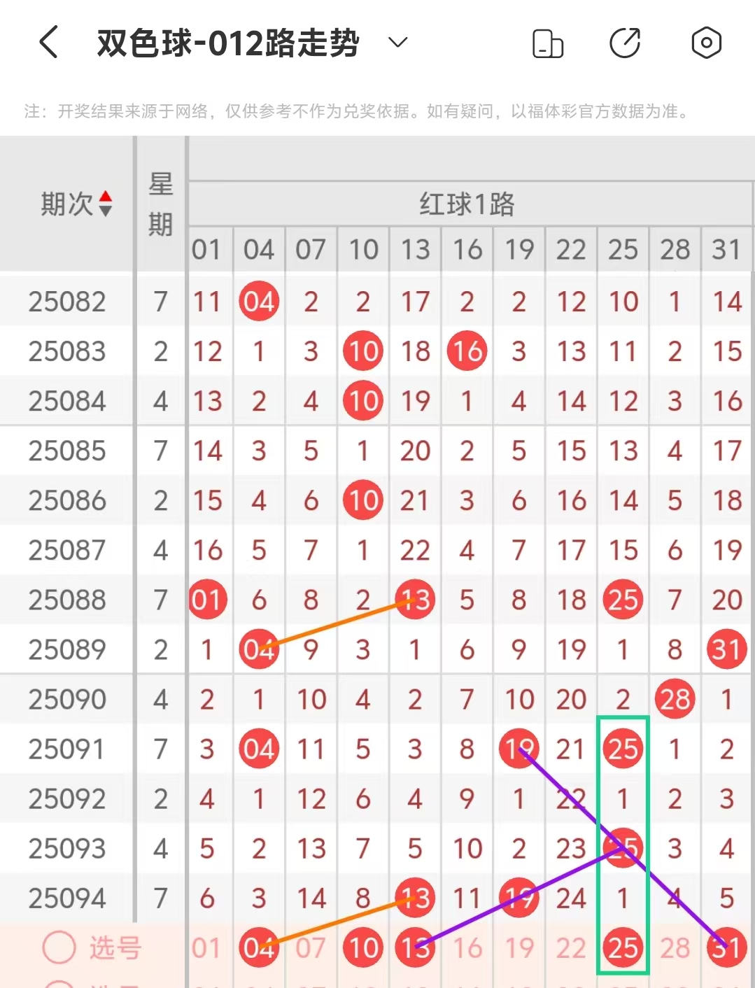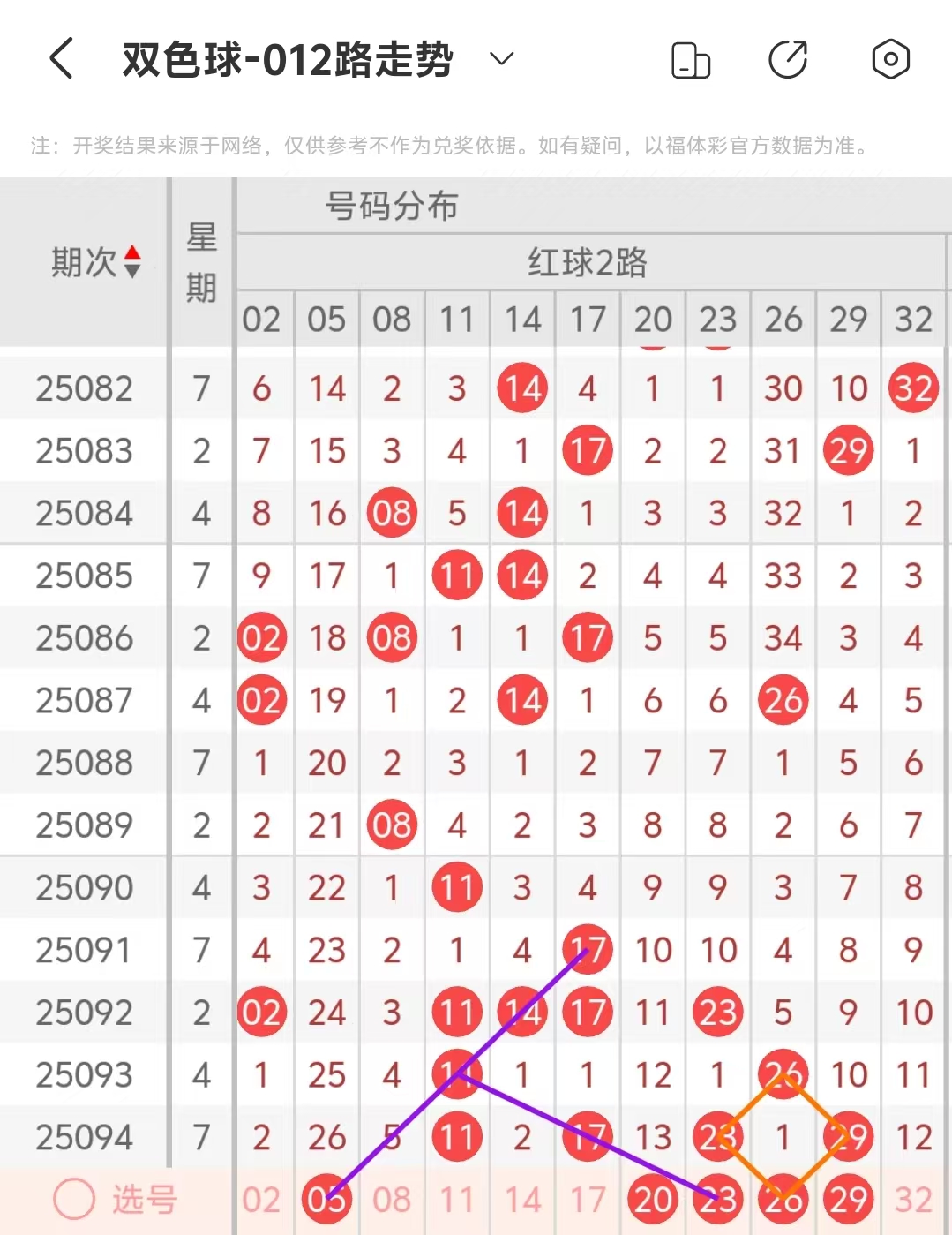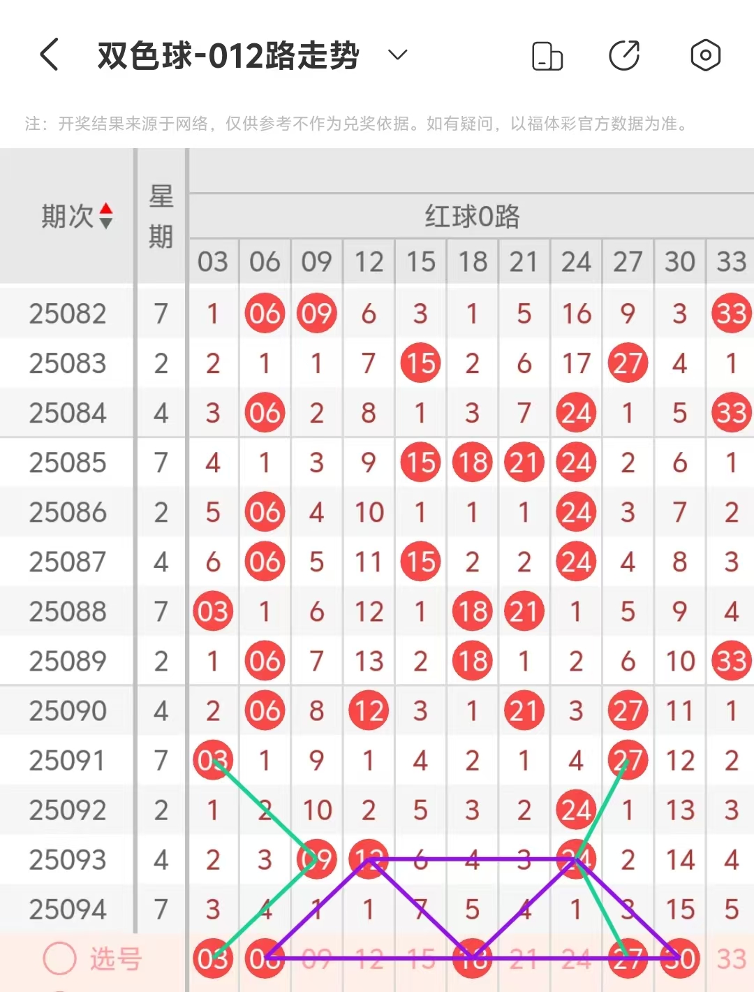 开奖号码红球一共是33个,每期开出6个,26期开156个,就把33个号码分成三个区,理论上每区开52个,按照012路分:一区0路,二区1路,三区2路: