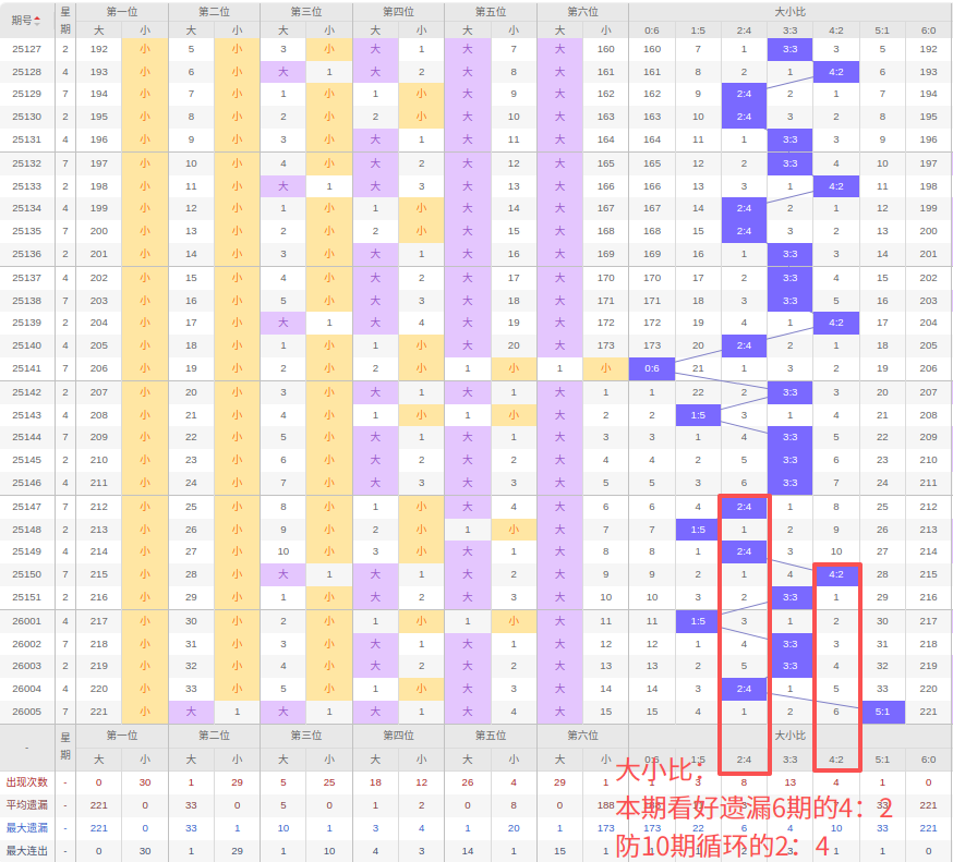 上期大小比:5:1,近10期大小比出现情况:2:4、1:5、2:4、4:2、3:3、1:5、3:3、3:3、2:4、5:1,最近10期出现3期3:3,出现1期4:2,出3期2:4,出现1期5:1,出现2期1:5,出现0期6:0,出现0期0:6,根据近10期规律本期看好遗漏6期的4:2,防10期循环出2:4,综上所述推荐大小比推荐:2:4,重点关注:4:2。