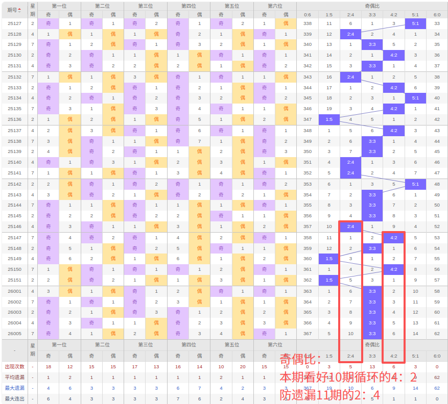 上期奇偶比:3:3,近10期奇偶比出现情况:4:2、3:3、1:5、4:2、1:5、3:3、3:3、3:3、3:3、3:3,最近10期出现6期3:3,出现2期4:2,出现0期2:4,出现0期5:1,出现2期1:5,出现0期6:0,出现0期0:6,根据近10期规律本期看好10期循环的4:2,防遗漏11期出2:4,综上所述推荐奇偶比推荐:2:4,重点关注:4:2。