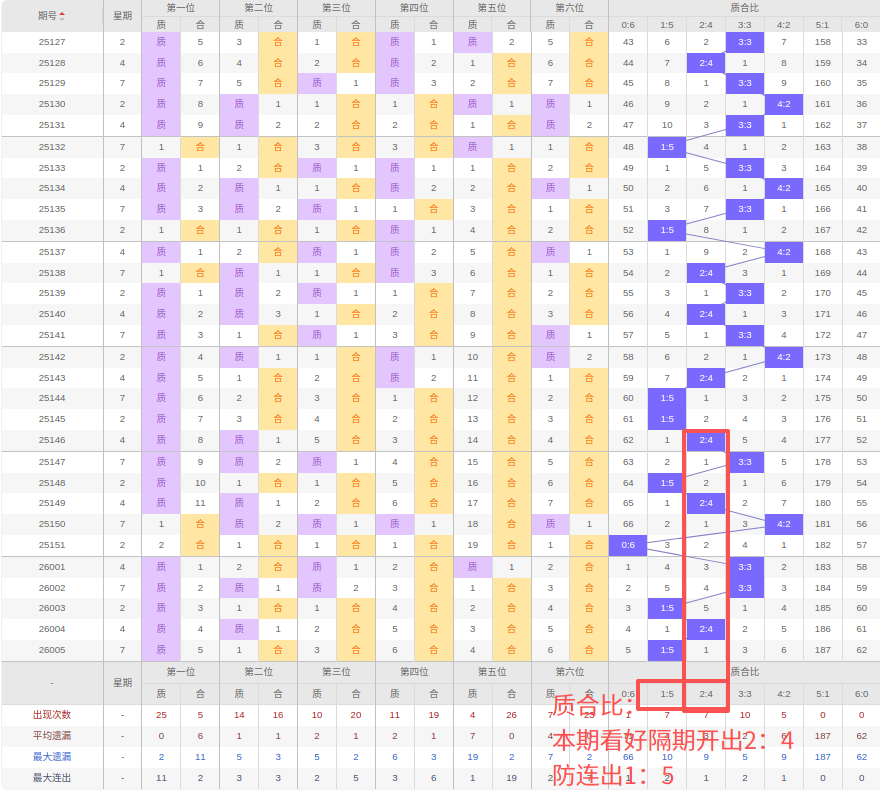 上期质合比:1:5,近10期质合比出现情况:3:3、1:5、2:4、4:2、0:6、3:3、3:3、1:5、2:4、1:5,最近10期出3期3:3,出现1期4:2,出现2期2:4,出现0期5:1,出现3期1:5,出现0期6:0,出现1期0:6,根据近10期规律本期看好隔期出2:4,防连出1:5,综上所述推荐质合比推荐:1:5,重点关注:2:4。