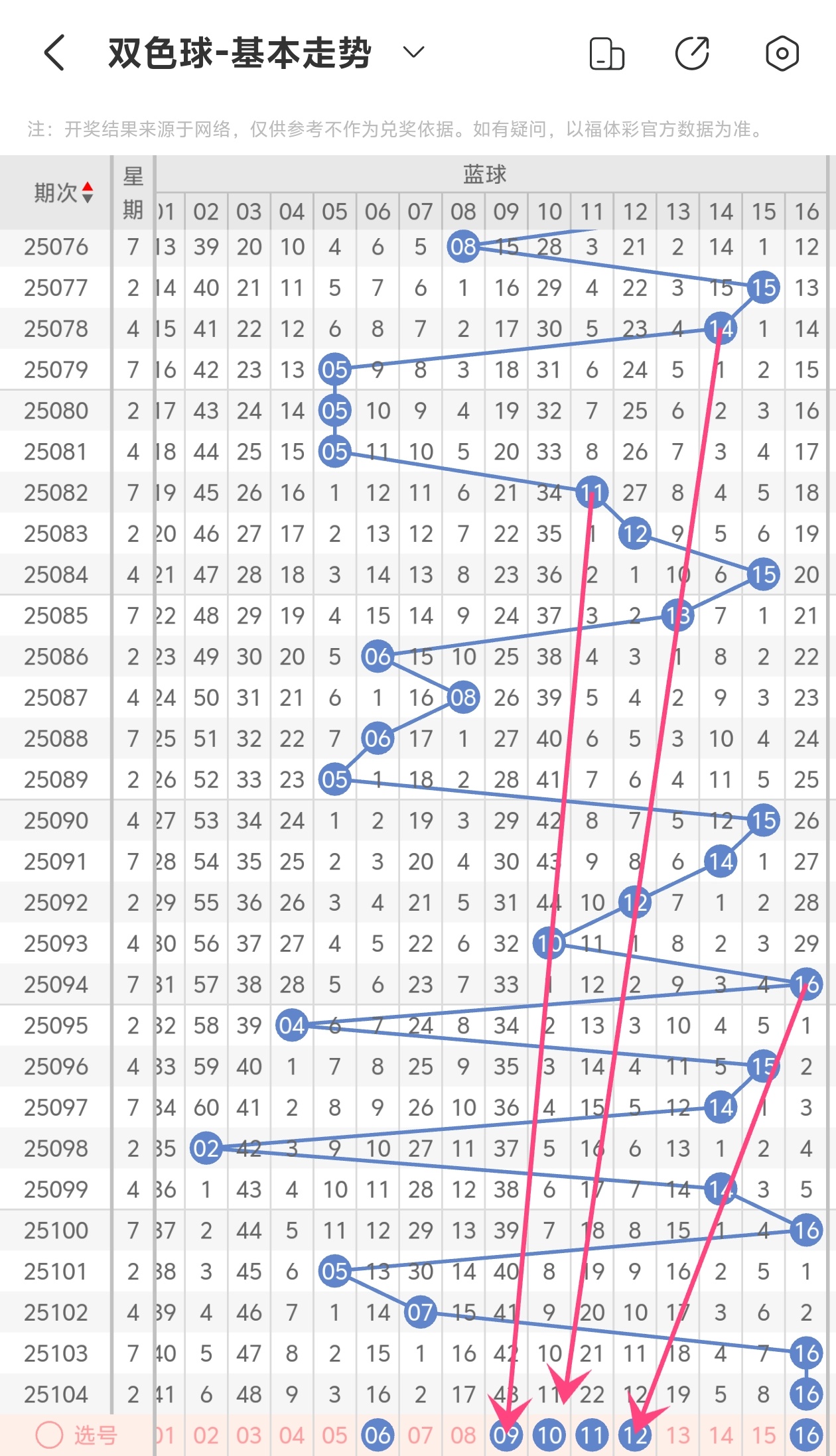 上期蓝球开出16,本期我们可以从上面走势图中看到选号的思路,04为斜连走势,10隔期回补走势,13为斜连走势,综合以上分析本期蓝球推荐01 04 08 10 13
