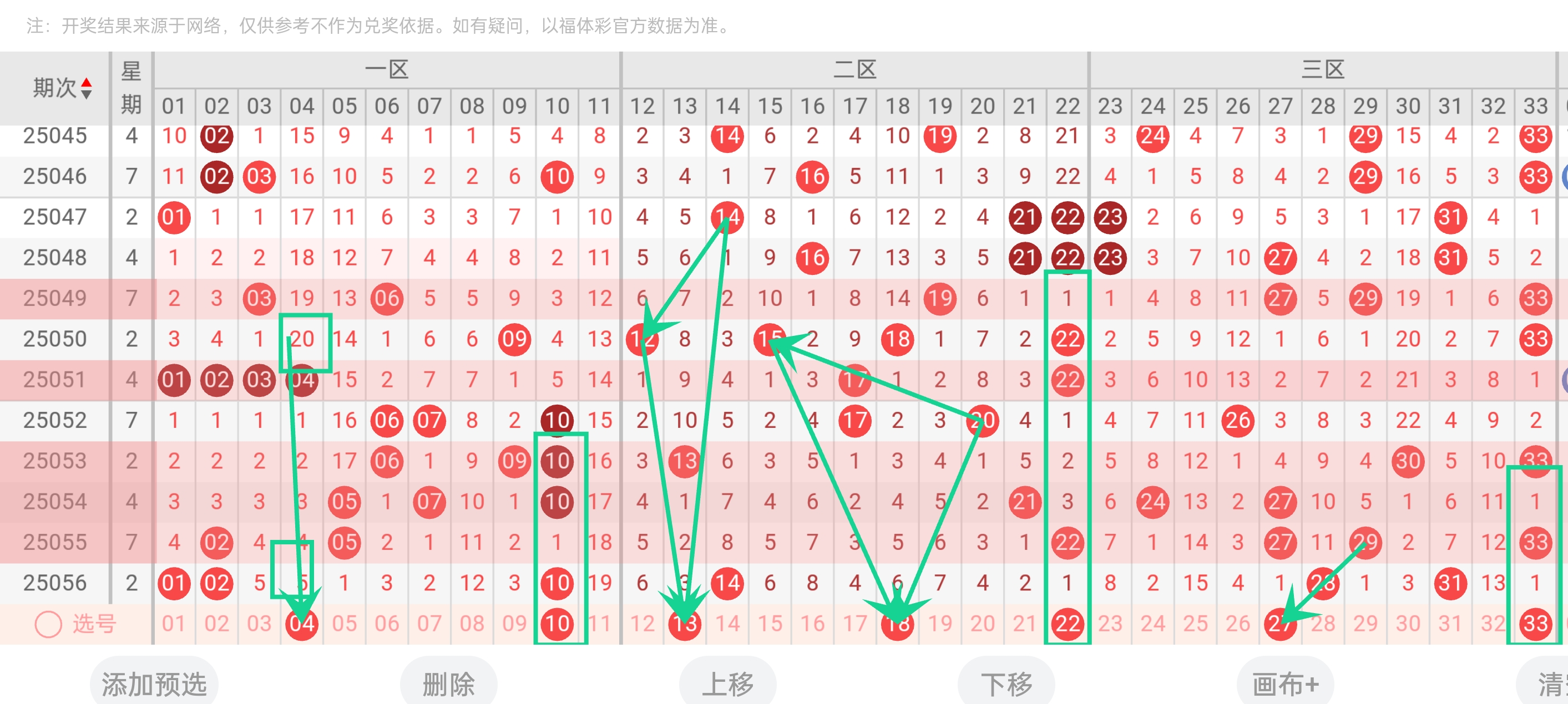 - 冷号回补:04、33 在近50期分别仅出现4次和6次,属于长期遗漏号。根据“冷热平衡”理论,冷号长期未出后可能回补,因此纳入组合。