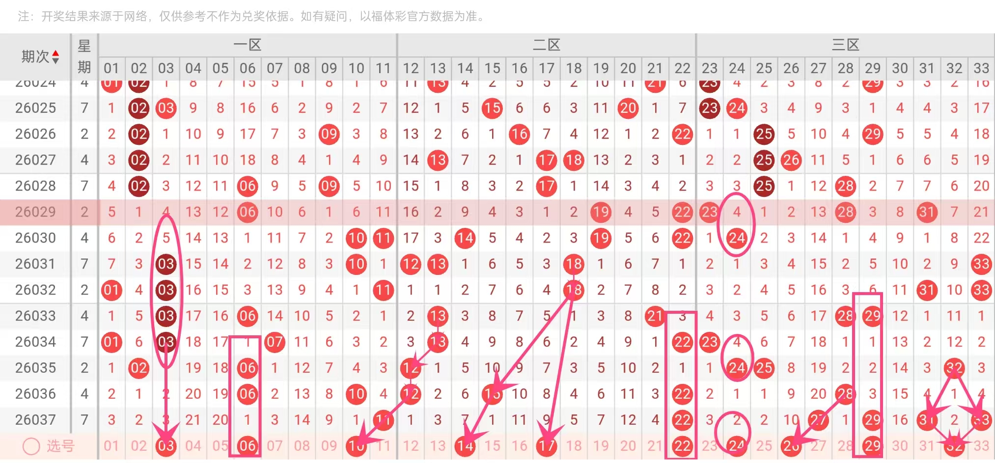 一区(01-11):03、06、10(3个);二区(12-22):14、17、22(3个);三区(23-33):24、26、29、32(4个)。三区略多,但上期三区有28、29两个,本期保留29并增加24、26、32,合理。