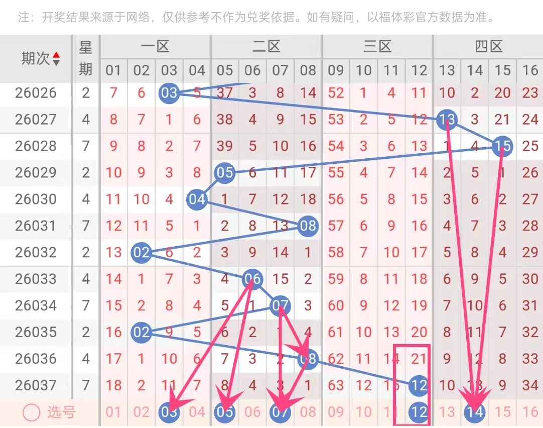 03遗漏4期(温),05遗漏4期(温),07遗漏9期(偏冷),12遗漏12期(冷),14遗漏13期(冷)。本组有两个冷号(12、14)和两个温号(03、05)及一个偏冷(07),冷热搭配合理。尤其14为超级冷号(近30期仅2026024出现一次),可博回补。