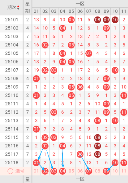 根据走势图可以看出当区段,109期开出05.06.09三个号码球 ,110期开出了01.05.11三个号码球,111期开出了09一个号码球, 112期开出了03.09.11三个号码球,113期开出了08.10二个号码球,114期开出了01一个号码球,115期开出来02.03.08三个号码球,116期开出来02.04.08三个号码球,117期开出了06.08二个号码球,118期开出了01.10.11三个号码球,按照如此规律本期当前区可能会开出1双或1单1双。我们看下当前区上期没有开出重叠号,那么本期当前区要定重叠号的情况下可关注11号码球。再看下当前区段上期没有开出斜连号,当期选号得留意09斜连号。建议重点关注02.03.04.07.09