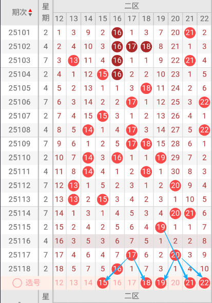 根据走势图可以看出当前区段,109期开出17.18二个号码球 ,110期开出了14.16.18三个号码球,111期开出了14.18二个号码球,112期开出了13.20二个号码球,113期开出了13.15二个号码球,114期开出了20.21二个号码球,115期开出来19一个号码球,116期没有开出号码球,117期开出了17.20二个号码球,118期开出了16一个号码球,按照如此规律本期当前区可能开出1单或2单。我们看下当前区上期没有开出重叠号,那么本期当前区要定重叠号的情况下可关注16号码球。再看下当前区上期开出16斜连号,当期选号得留意斜连15号码球。本区重点关注15.18.19.21.22