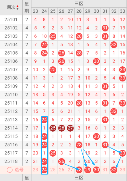 根据走势图可以看出当前区,109期开出31一个号码球 ,110期没有开出号码球,111期开出了28.31.33三个号码球,112期开出了32一个号码球,113期开出了24.31二个号码球,114期开出了25.26.27三个号码球,115期开出来24.30二个号码球,116期开出来24.28.30三个号码球,117期开出了25.33二个号码球,118期开出了24.26二个号码球,按照如此规律判断本期当前区可能开出1单1双。我们看下当前区上期没有开出重叠号,那么本期当前区要定重叠号的情况下可关注24码球。再看下当前区上期开出24.26斜连号,当期选号得留意25斜连号。本区重点关注24.28.29.30.32