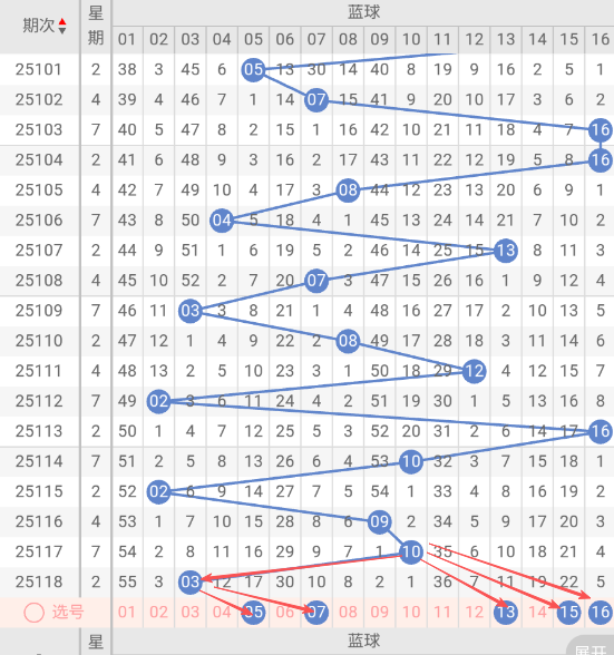 根据走势图近10期的走势看,蓝球在107期开出13蓝球之后,3小1大1小2大1小2大1小,再看下近10期的蓝球热码有回补的趋势,这种趋势规律本期判断极有可能开出小号,本期防蓝球12大号,蓝球本期重点关注05,07,13,15,16