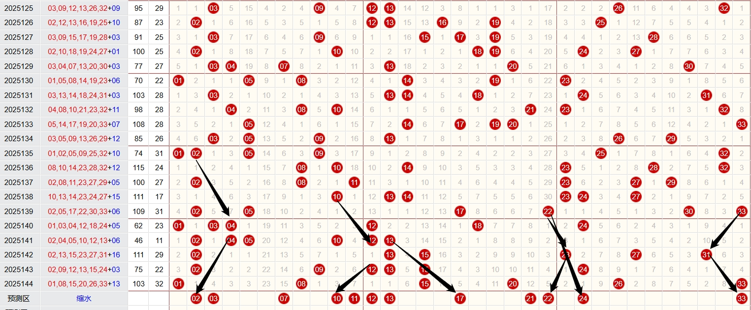 回顾上期25144期开奖01 08 15 20 26 33 + 13 ,其中一小区01-11出2个,二小区12-22出2个号,三小区23-33出2个!