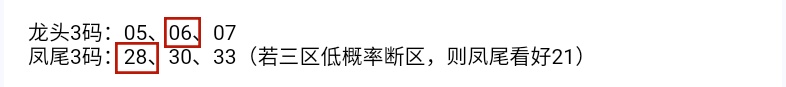 下面是会员文章截图,每个区间给出更详细的分析,推荐关注号码一区06 11,二区21,三区28,判断正确,上期红球命中4码!