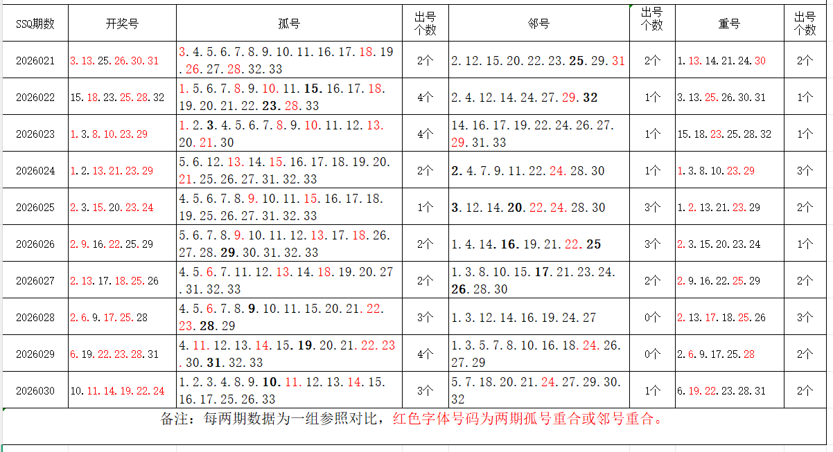 如图,以近两期数据为一组,进行对比分析。相同的孤号、邻号,可能在下期出1-4个左右。上期开出孤号3个,邻号1个,重号2个。本期参考孤号:1.2.3.4.5.6.7.8.16.17.26.27.28.29.30.31.32.33;邻号:9.12.13.15.18.20.21.23.25;孤、邻号重合号码精选:***(会员专区可见)。个人分析,仅供参考。