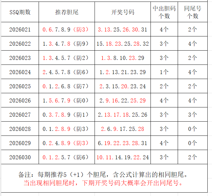 如图,每期推荐胆尾中出1-4个。上期推荐胆尾中出3尾3码!推荐胆尾是按照公式计算的顺序,不定位红球号码的顺序。本期推荐胆尾:5尾/6尾/3尾/1尾/2尾 。加推重点胆尾:***(会员专区可见)。推荐胆码号码:***(会员专区可见)。个人分析,仅供参考。