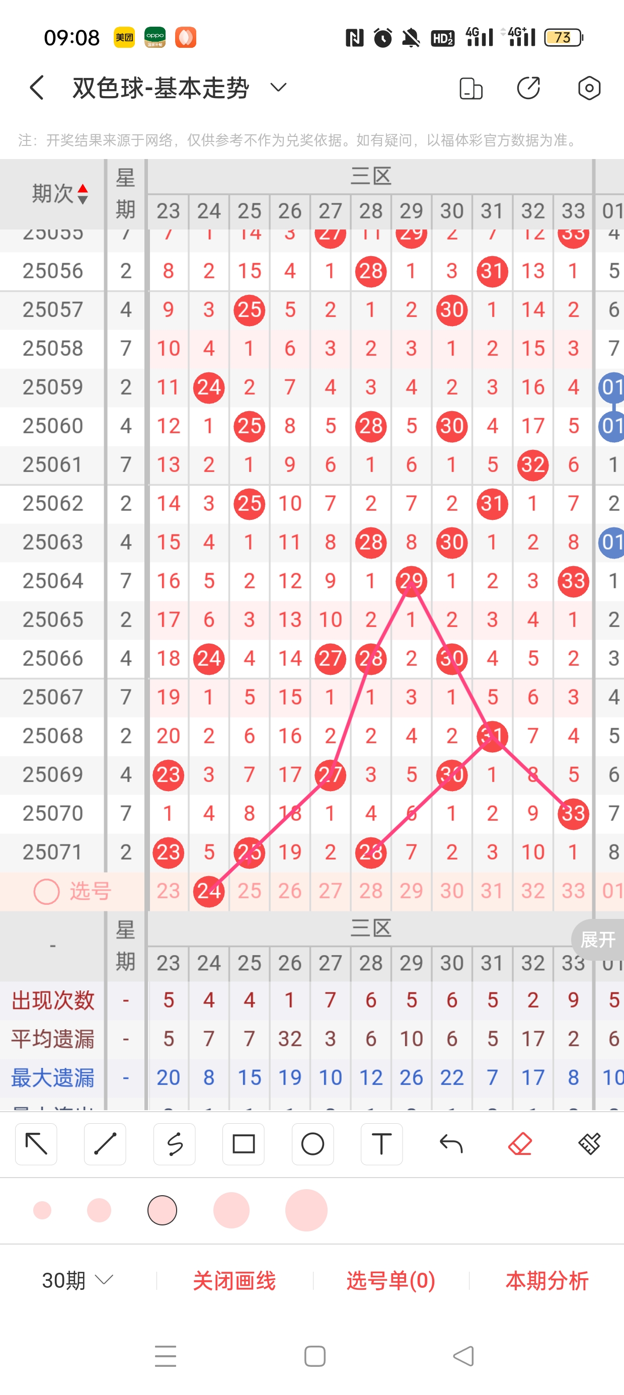 三区(23-33)近69期本区邻孤传20邻73孤6传,孤号热度高,本期着重邻传。近69期本区012路45:27:34,0/2路热度高,本着重1路。24已遗漏5期,与25之间呈现向左遗漏递减态势,需防。