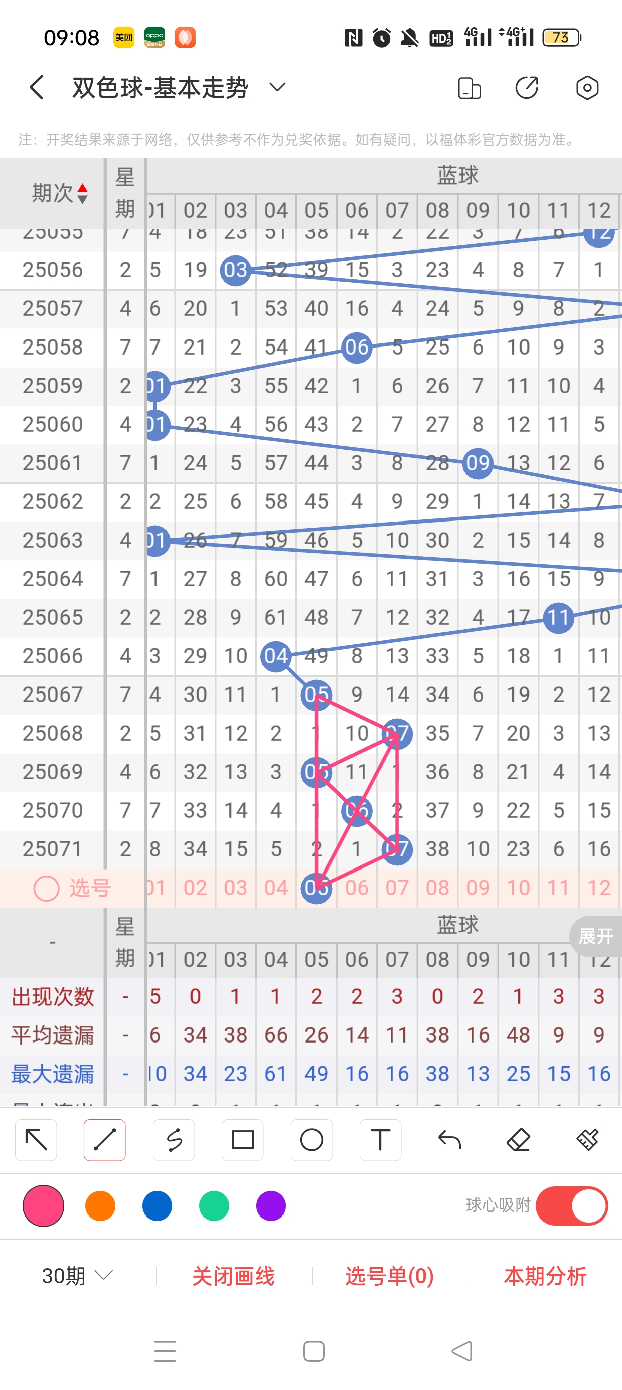 后区(1-16)近69期本区012路13:21:37,1/2路热度高,本期着重0路。5已遗漏2期,与6之间呈现向右遗漏递减态势,需防。