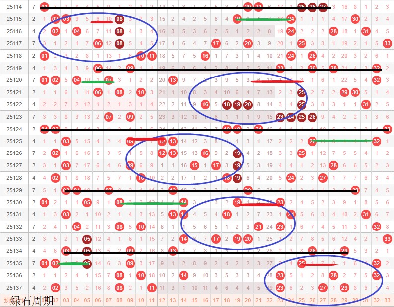 如图所示:体现的是3个局部走势的发展周期,圆圈为密集处的填空,本期定性为新局部走势5期,架构填空第2期,主力填空第3期,预估蛋跨在3区22-32,本期绿色线属于右推跨区间比,红色线填点位,蛋跨预估3-4枚。