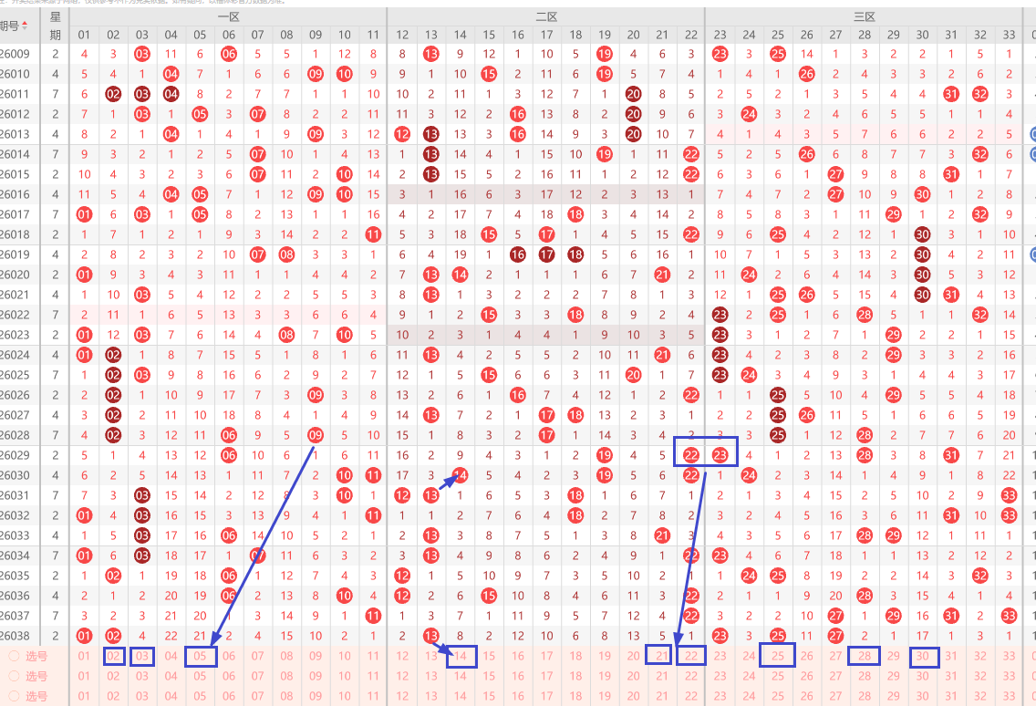 本区间号码上期仅开出1个,对于本期选择还是有点难度。首先看的是邻号14,搭配出来近期的热码数字22,对于这种情况只能是把握这种遗漏没几期的号码。然后根据之前的组合,这个区间连号的几率也是比较大,暂且画出数字21.22组合。