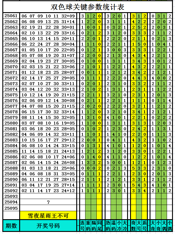 以下是作者手工统计的双色球关键参数统计表,对喜欢参数分析、过滤缩水、选号胆杀的技术性双色球爱好者有所帮助,其它读者可略过不看。