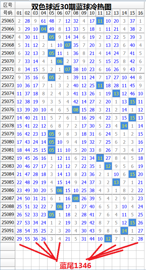 本期蓝球冷码(遗漏10期以上)01 02 03 04 07 09 10 11 16 共9枚。
