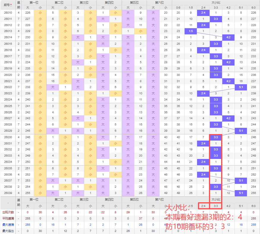 上期大小比:5:1,近10期大小比出现情况:3:3、2:4、3:3、3:3、2:4、3:3、2:4、5:1、3:3、5:1,最近10期出现5期3:3,出现0期4:2,出3期2:4,出现2期5:1,出现0期1:5,出现0期6:0,出现0期0:6,根据近10期规律本期看好遗漏3期的2:4,防10期循环的3:3,综上所述推荐大小比推荐:3:3,重点关注:2:4。