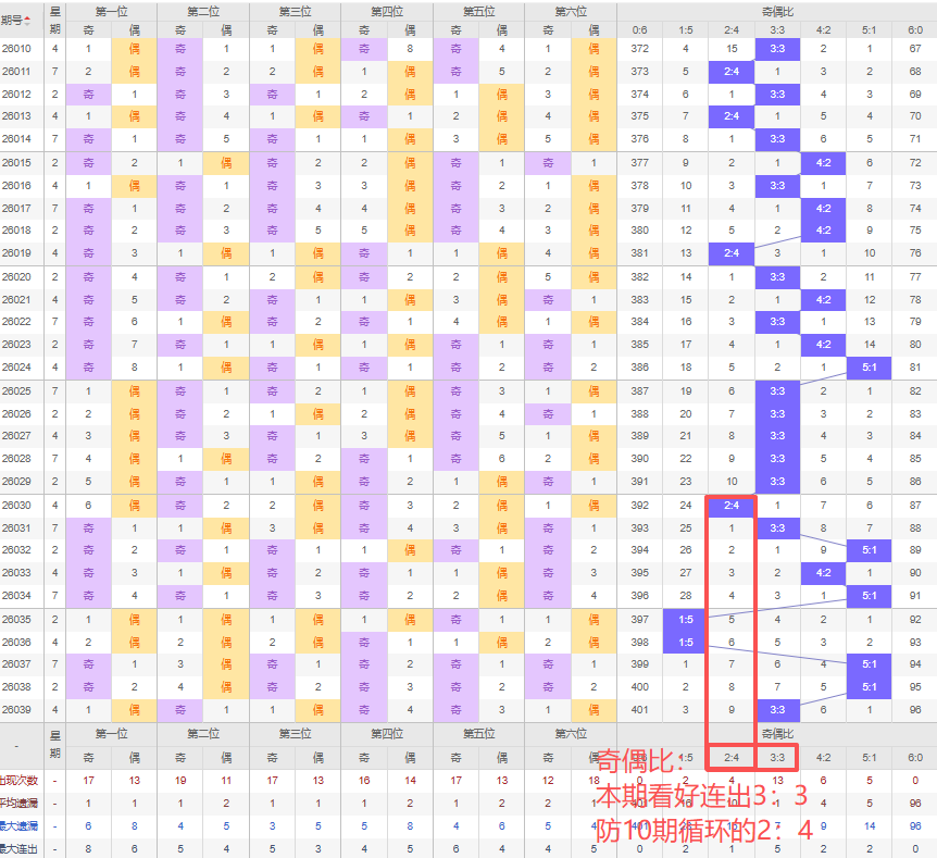 上期奇偶比:3:3,近10期奇偶比出现情况:2:4、3:3、5:1、4:2、5:1、1:5、1:5、5:1、5:1、3:3,最近10期出现2期3:3,出现1期4:2,出现1期2:4,出现4期5:1,出现2期1:5,出现0期6:0,出现0期0:6,根据近10期规律本期看好连出3:3,防10期循环的2:4,综上所述推荐奇偶比推荐:2:4,重点关注:3:3。