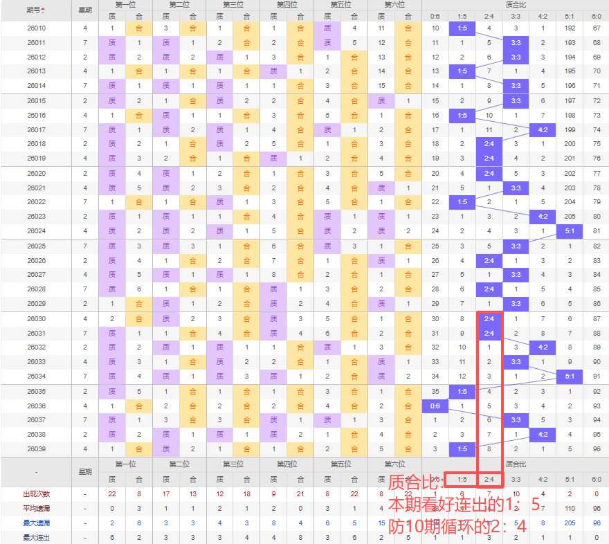 上期质合比:1:5,近10期质合比出现情况:2:4、2:4、4:2、3:3、5:1、1:5、0:6、3:3、4:2、1:5,最近10期出2期3:3,出现2期4:2,出现2期2:4,出现1期5:1,出现2期1:5,出现0期6:0,出现1期0:6,根据近10期规律本期看好连出1:5,防10期循环的2:4,综上所述推荐质合比推荐:2:4,重点关注:1:5。